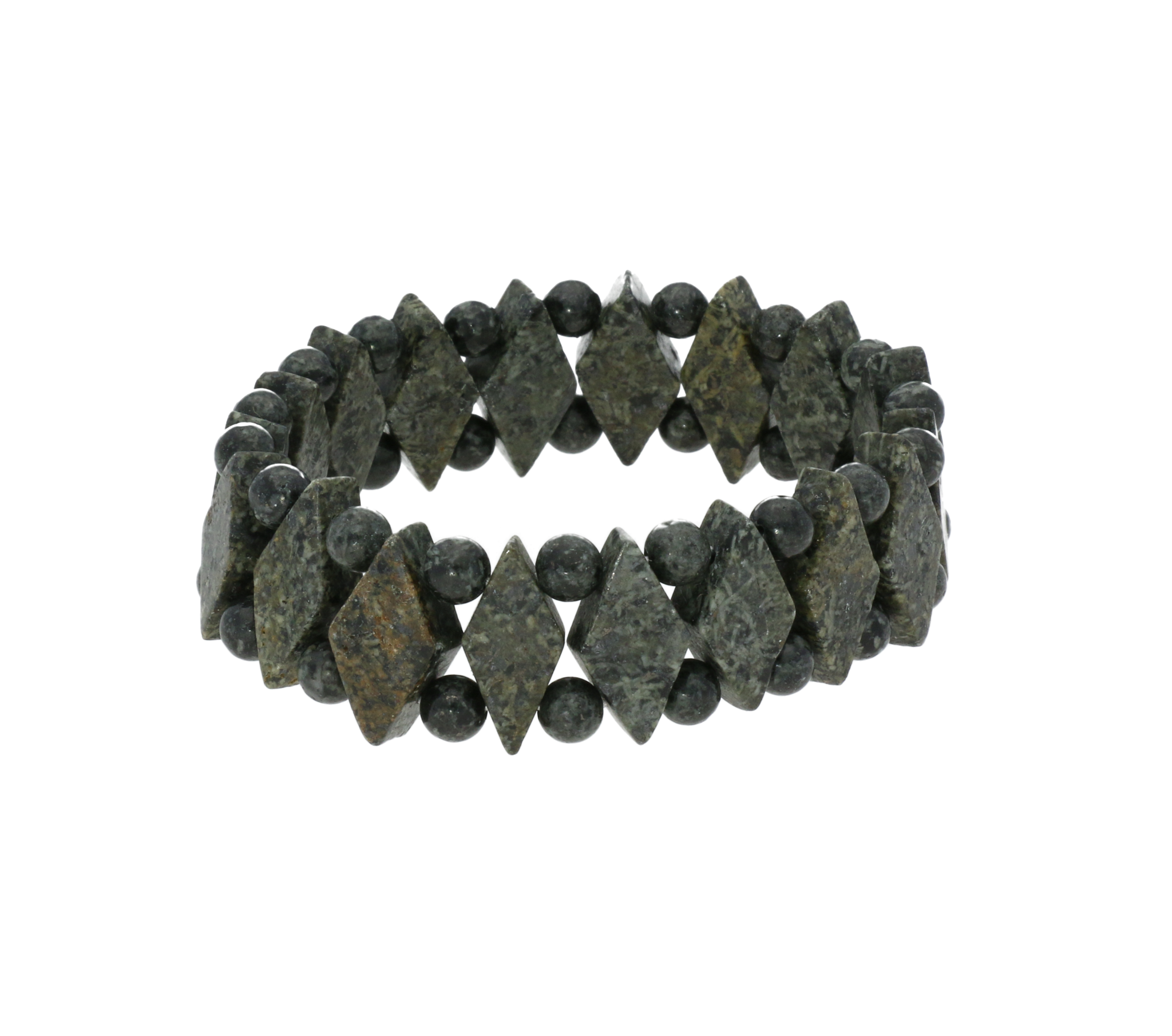 This stretch bracelet features eighteen diamond pieces of Preseli stone with alternating Preseli round beads