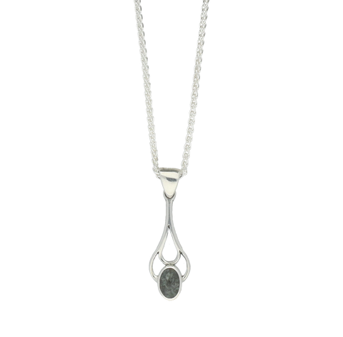 This elegant necklace, features a hand carved and highly polished heart shaped piece of Preseli Bluestone set within an open spoon sterling setting to create this design, proven to be our most popular collection. The chain is not included.