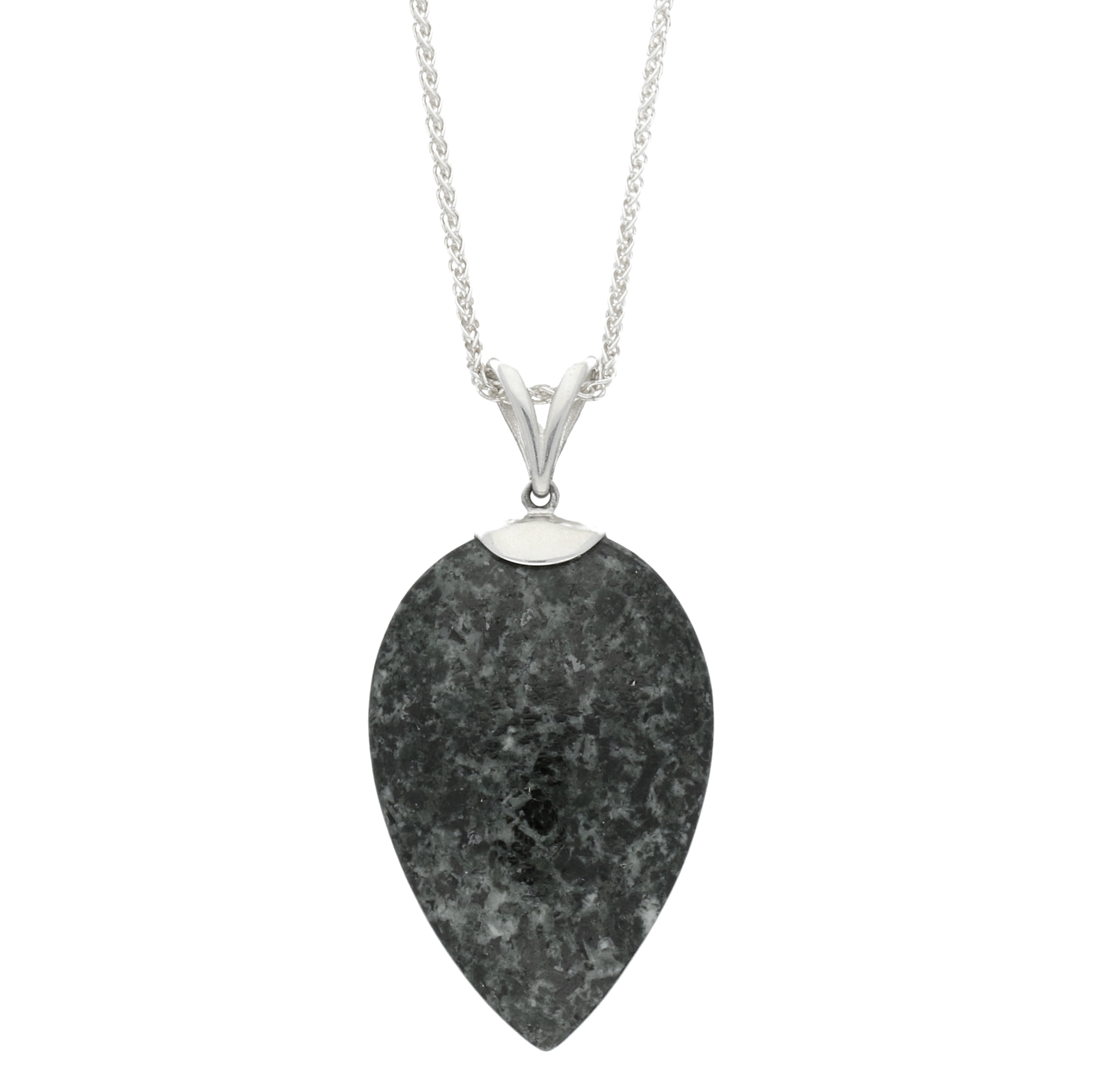This necklace features a hand carved highly polished smooth piece of Preseli Bluestone cut into a pear shape to create this pendant. It comes complete with the sterlins silver 18" chain.