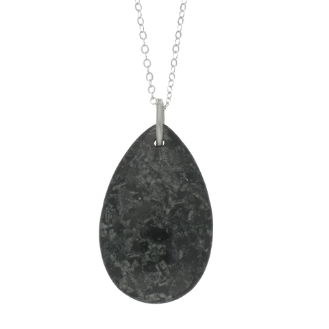 This necklace features a hand carved highly polished smooth piece of Preseli Bluestone cut into a pear shape to create this pendant. It comes complete with the sterling silver 18" chain.