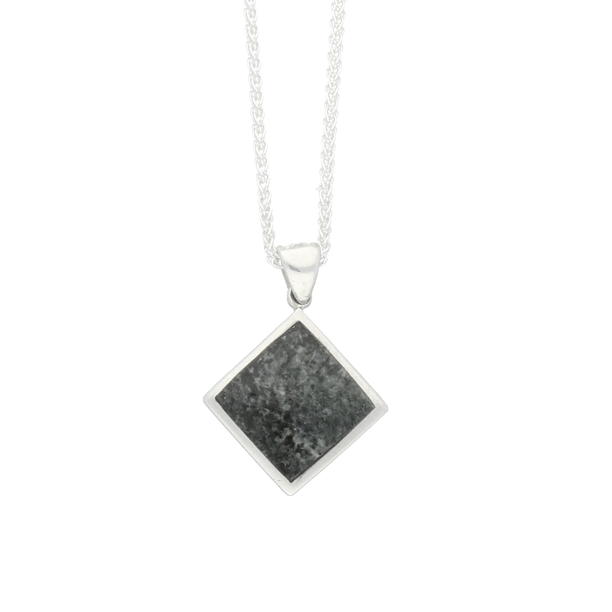 This necklace features a hand carved highly polished smooth piece of Preseli Bluestone cut into a square shape and set within the sterling silver setting to create this elegant pendant. It comes complete with the silver 18" chain.