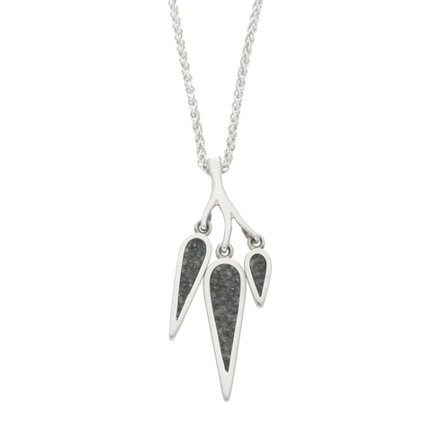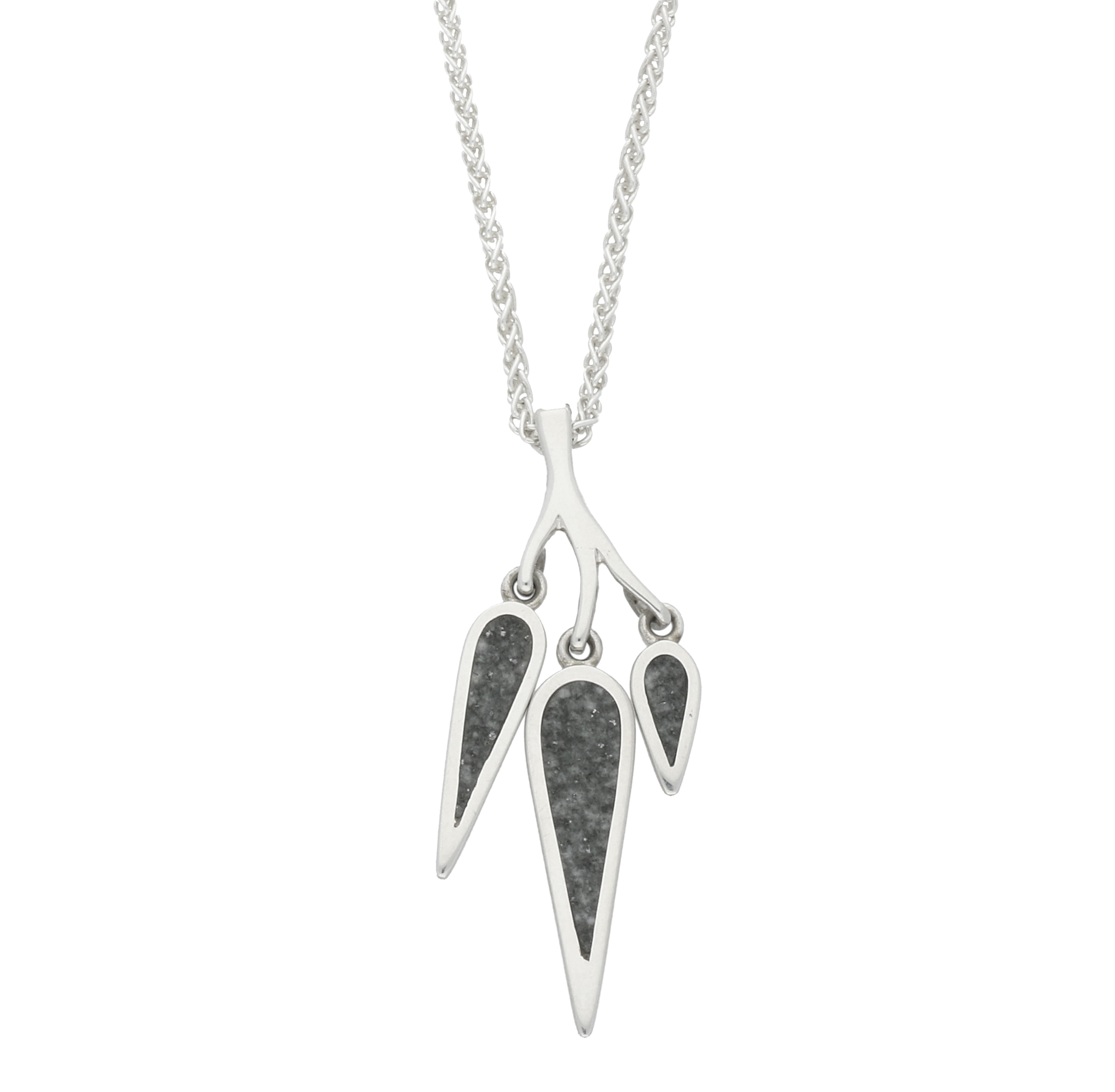 This elegant pendant, features three hand carved and highly polished long pear shaped pieces of Preseli Bluestone set within this beautiful design. The three graduating drops have been suspended from a branch bail to create this delicate pendant. The chain is not included in the price